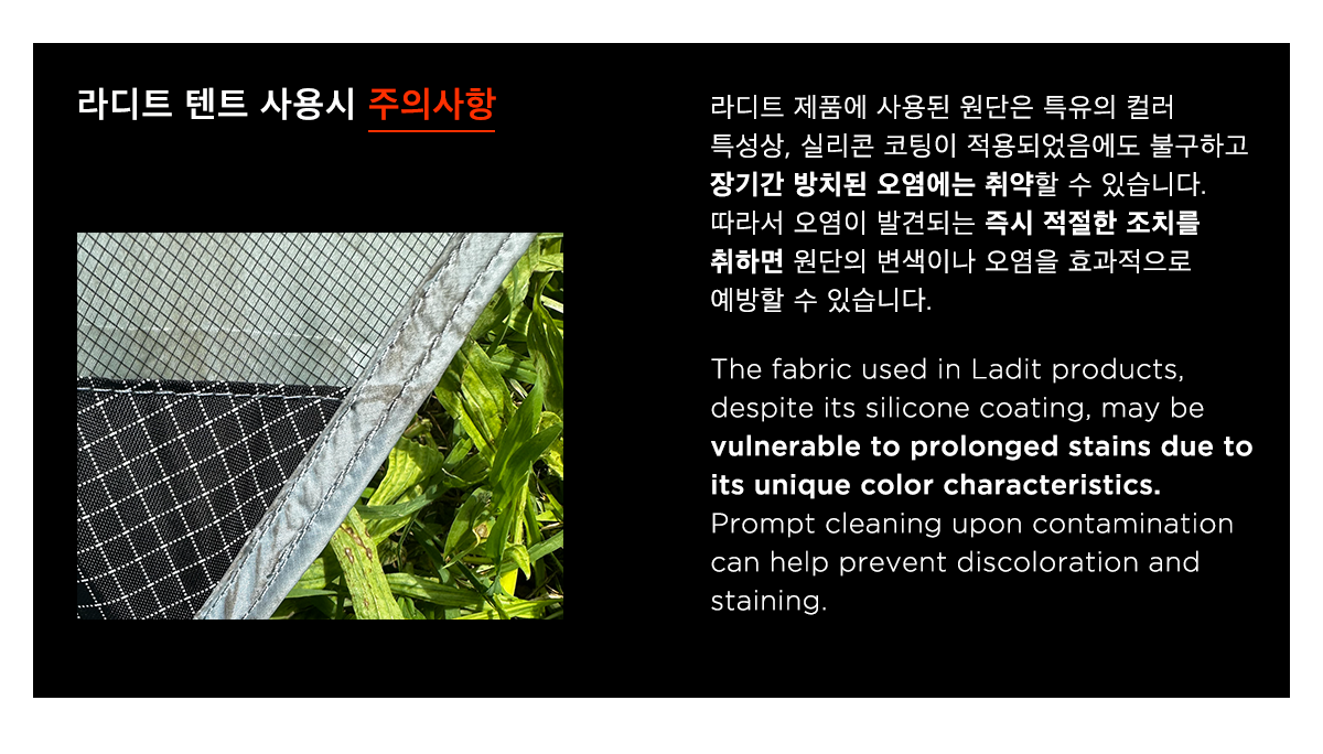 * 설치 시 고르지 못한 상태의 바닥 위에서 원단을 밟거나 바닥과 지속적으로 마찰이 생길 시 텐트 원단이 손상될 수 있으니 주의해주시기 바랍니다.